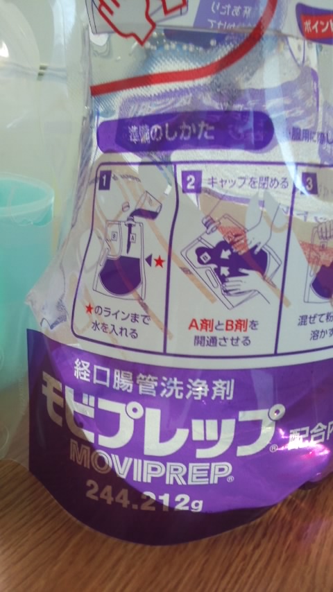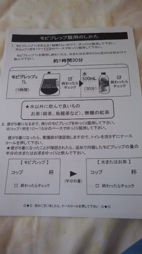 ・検査当日は朝9時から日帰り入院。午前中は腸管洗浄剤(下剤)と水を飲んでおなかをきれいにする。