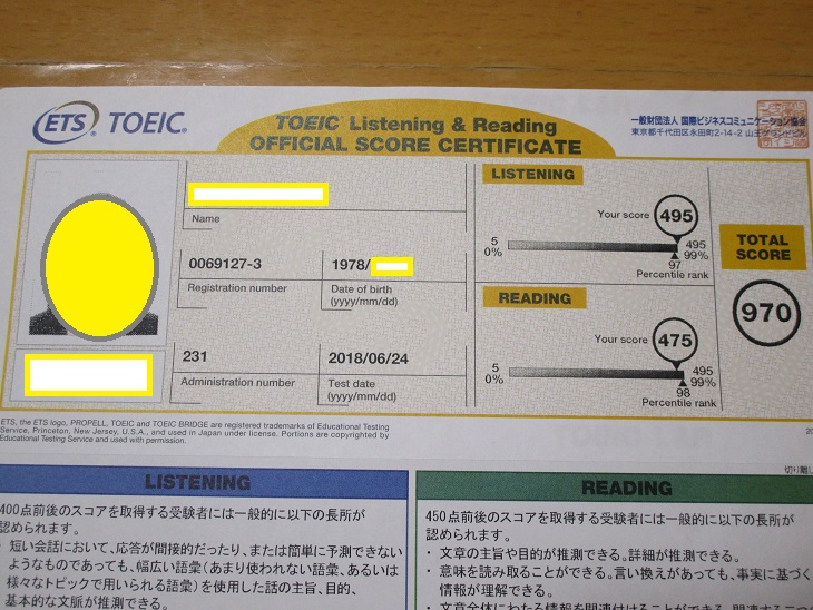 リスニング満点、リーディング475点、計970点!!(※990点満点)