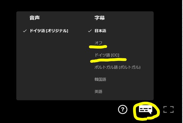 普通に何もやらないでいると、音声がオリジナル(=ドイツ語)、字幕が日本語で視聴できます。字幕Offもできるので、リスニングに集中することもできます。なんならドイツ語字幕の表示もできます。
